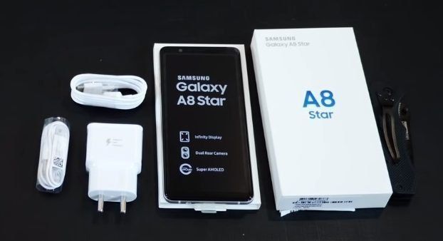 Samsung Galaxy A8 Star اسمارٹ فون ایک باقاعدہ سفید گتے کے باکس میں پیک کیا گیا ہے۔