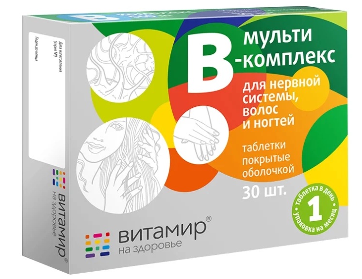 多 B 复合维生素标签。 p / o No. 30 旨在改善皮肤、头发和指甲以及神经系统的状况。它适用于 18 岁以上的人。它被用作生物食品补充剂,作为 B 族维生素、肌醇、含有胆碱的对氨基苯甲酸的额外来源。